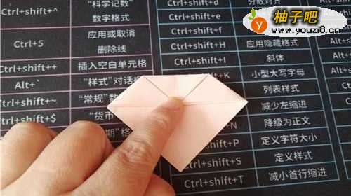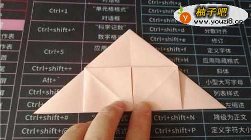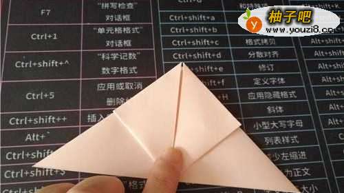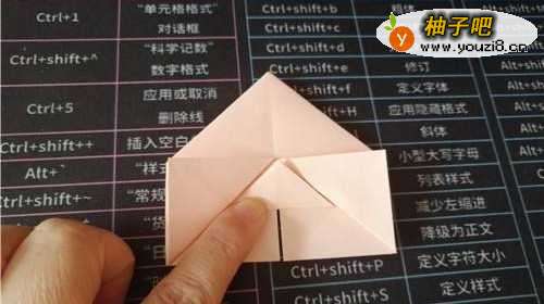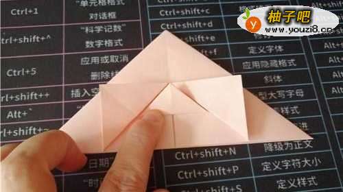 4把中间的角向上折,如图一。把彩纸翻到另一面,如图二。