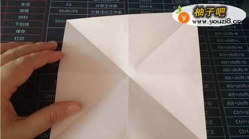 先把彩纸的中间折出米字形,按照折痕把彩纸折成图二的样子。