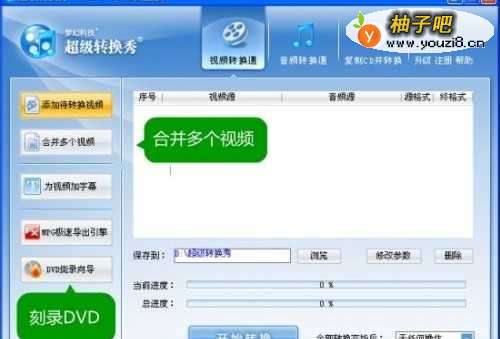 按照下图的指引,我们可以导入AVI,TP,MKV,MTS,MP4等几乎所有的视频格式。在下图中,我们可以发现,软件支持合并多个视频。“DVD烧录向导”功能可以帮助我们刻录DVD光盘,非常实用。
