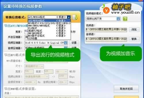 软件支持导出AVI,FLV,MPG,MOV,WMV等众多流行的视频格式。视频的宽高、视频编解码器等设置灵活。点击“音频源”处的“替换”按钮,即可为视频添加喜欢的音频文件。