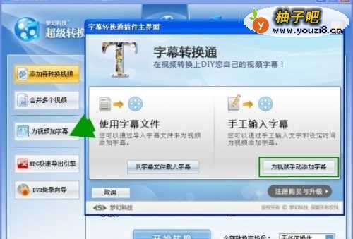 我们可以使用超级转换秀的功能增强插件《字幕转换通》,协同超级转换秀为视频添加类似电影旁白的字幕以及添加外挂字幕等功能的。点击截图中的“为视频手动添加字幕”按钮,在弹出的对话框中,即可详细设置,非常方便的。