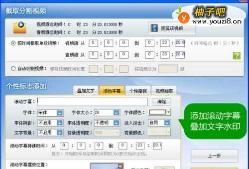 接着我们就可以在下图中添加滚动字幕和静态文字了。你可以自定义字幕出现的位置、时间、以及字体、颜色等属性。点击“个性商标”选项卡,我们可以为视频打上自己的LOGO的。