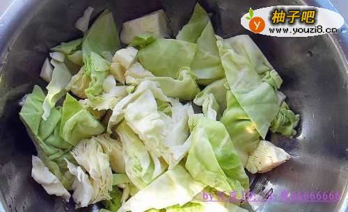 2先把卷心菜切成块,清洗干净,沥干水分,备用。