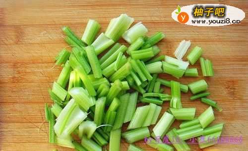 3芹菜摘掉叶子,也要清洗干净,切成长度差不多的段。