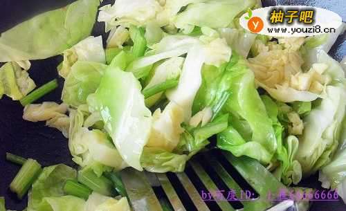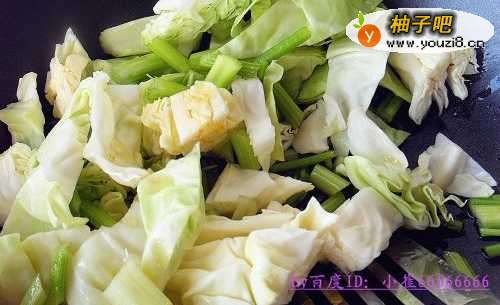 5锅里倒入适量的玉米油,先把卷心菜和芹菜一起放进锅里翻炒。