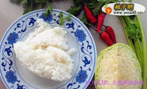 这道炒饭还真不难。先准备好主要的食材:剩米饭,卷心菜,芹菜和红辣椒。