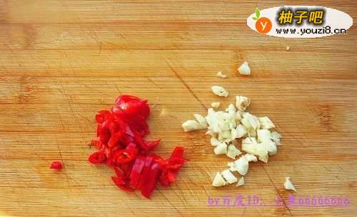 4接下来要把红辣椒切成丝,大蒜切成蒜末。因为小编的红辣椒超辣,所以把籽去掉了,您可以根据自己的口味哦!