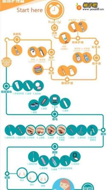 选购完适合自己的化妆品后,有些妹子就会问,保养和化妆的顺序究竟是怎么样的呢?下面这张图完整的列出了妆前护肤品先后使用顺序以及化妆的步骤,还处于迷糊状态的你赶快来学习一下修容小颜化妆教程吧!!!