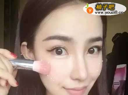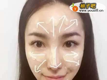 2粉底液 均匀的把粉底液点在脸上用粉底刷朝剪头方向刷匀