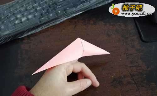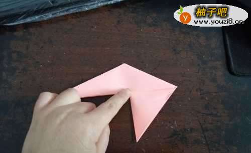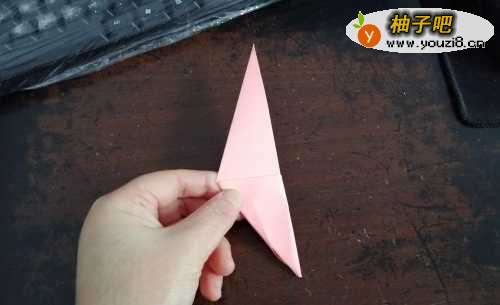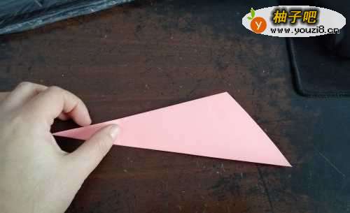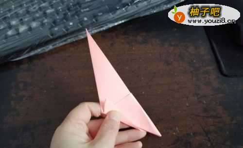 4我们继续把角向另一面折,并把角插进彩纸里,如下图的样子。