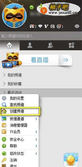 在YY界面的左下角。有一个YY图标,点击,选择“创建频道”
