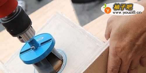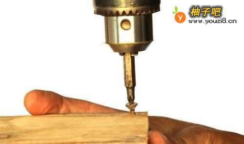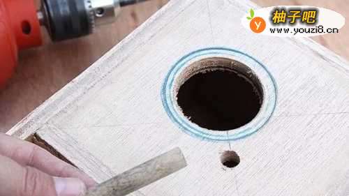 5在正面的木板上凿孔。如图所示,用一把大小合适的孔钻,在正面的木板上从上往下大约6.5厘米处,凿一个圆孔。