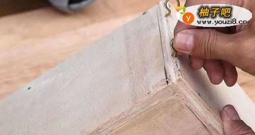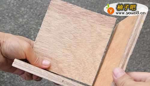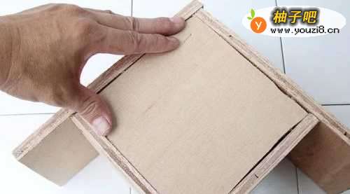 2将背后的木板连接上去。裁下一块边长约17.5厘米的正方形木板作为背后的木板,用胶沿着底面木板的边缘粘上去。晾干以后,用钉子钉好,四段距离应该相等,钉子从背后的木板一直穿进地面的木板中。