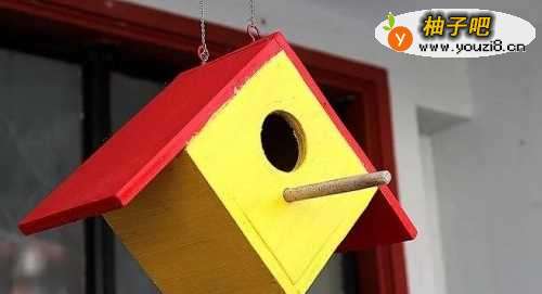 11最后完善细节。如果你打算用这个鸟屋吸引野生鸟类来住,那么就用比较低调的颜色,像是棕色和绿色等,因为野生鸟类比较偏爱这些颜色。然后可以在鸟屋上加上你喜欢的其他装饰,再挂到房梁上。