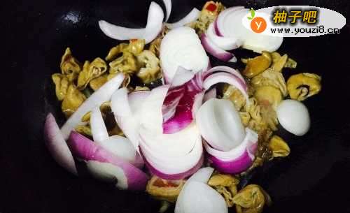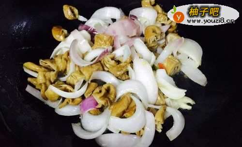 4肥肠爆炒1分钟之后就可以把切好的洋葱丝倒进去大火快速翻炒了!