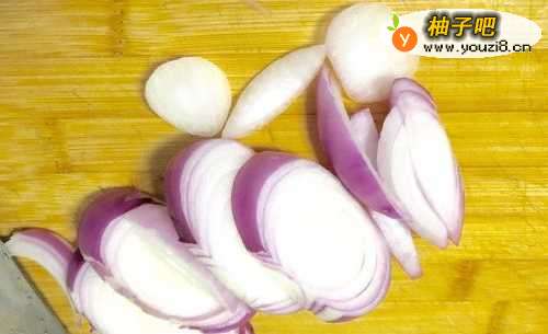 2接着将洋葱撕掉外皮,然后切掉根部和头部清洗干净切成丝备用!
