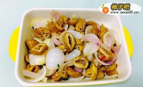 6最后一步就是熄火起锅,将炒好的洋葱爆肥肠装盘端上桌享用啦!