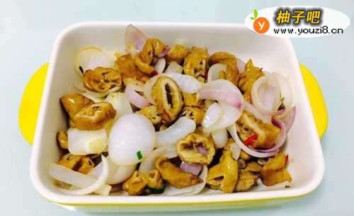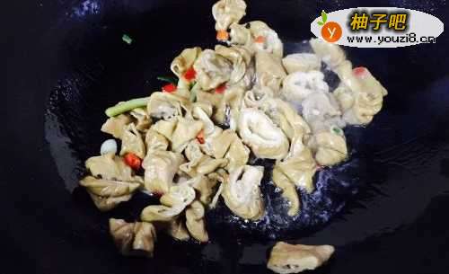 5洋葱倒进去之后继续翻炒大约1分钟即可,因为洋葱本身就可以生吃,肥肠也是熟的,所以这道菜整个烹制时间大约3分钟就可以!