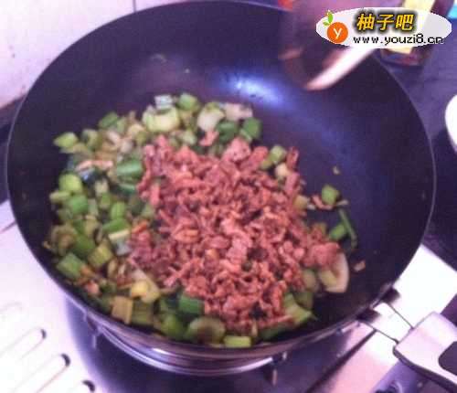 12打开锅盖,将已经炒好的肉放入芹菜中: