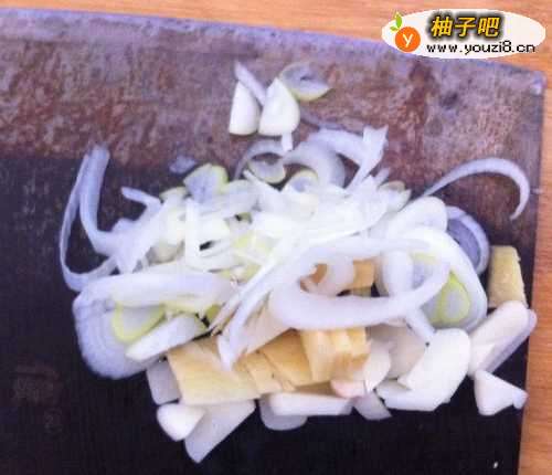 5等油红了之后,然后将葱姜蒜放入锅内,进行翻炒: