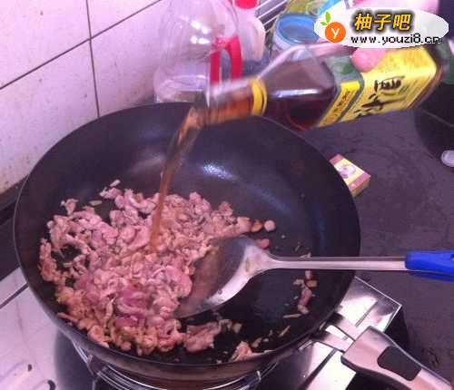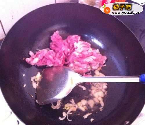 6等葱姜蒜都有点儿发黄色的时候,伴有淡淡的香味将肉放入锅内晃民摸进行翻炒。