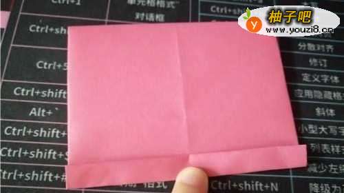 4把彩纸翻面,下面的边上折一点,如图一。再把下面的两个角向上折,如图二。
