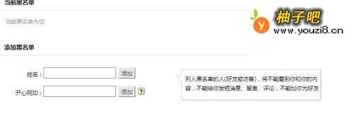 6点击黑名单,然后输入姓名,和开心ID,进行添加设置。选择的名单,就会被列入黑名单。