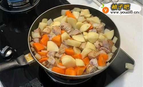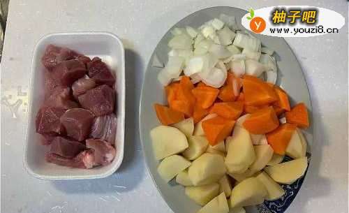 猪肉、洋葱、土豆、红萝卜切小丁。