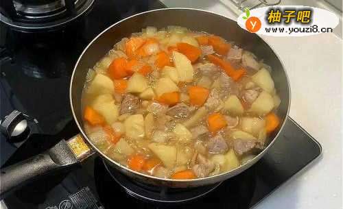4红萝卜与土豆拌合均匀后适量米酒煮一下,加入酱油、味醂再煮一下,加入高汤,开大火将酱汁煮沸,中小火锅盖闷煮约10 -15分钟。