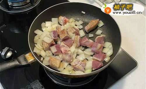 3将肉炒至金黄色。