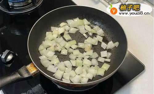2开中火热锅,奶油块煎至溶解,将洋葱丁炒香。
