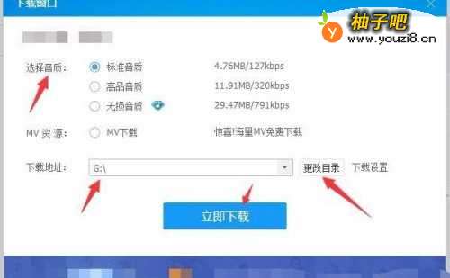 6登录完成进行下载,下载中选择下载音质,这里我们还可以进行设置下载路径的,不过我们在设置中已经设置好路径这里就会选择默认,如图。