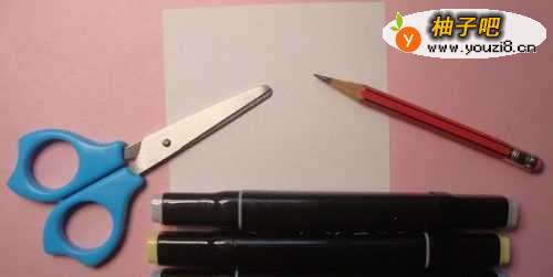准备好,制作梳妆台图形剪纸手工的材料和工具,有白纸、正方形卡纸、马克笔、铅笔,剪刀,如下图所示。