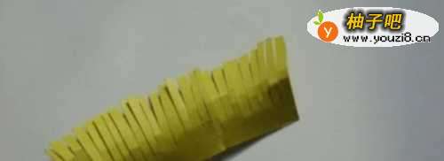 3然后把黄色纸条剪出流苏状当花蕊,然后用胶棒粘在紫色纸条一端,然后将紫色纸条卷起来,如图。