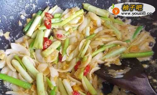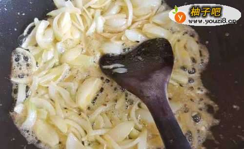 3原锅再放入洋葱丝稍微炒软, 再何扯倒入葱段略炒