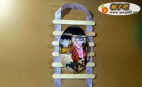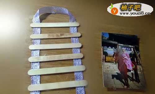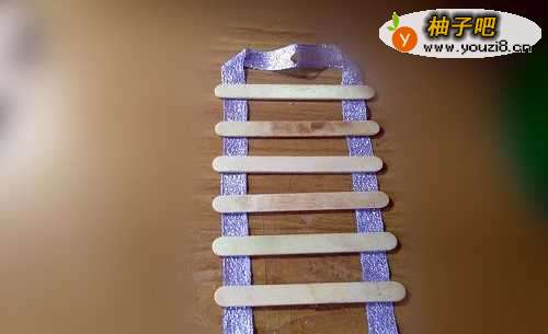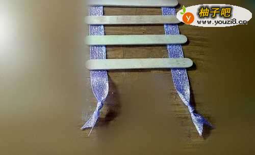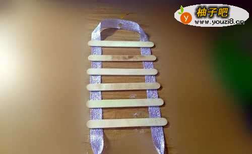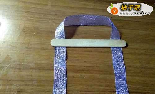 把一段丝带折成倒U形,用强力胶在上面粘一根冰棍棍儿。