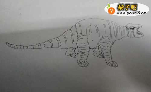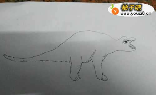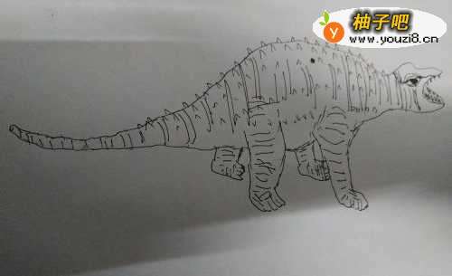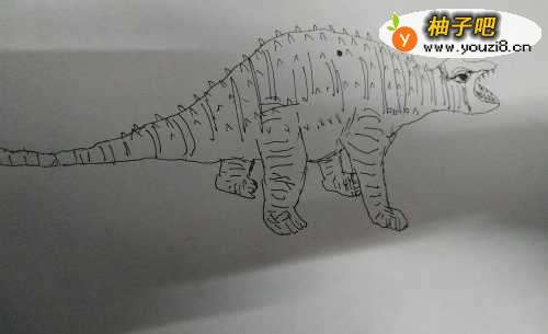 6用黑笔勾勒棘刺龙的尾巴和身上的斑纹,棘刺,眼睛,鼻子,嘴巴,牙齿等。一只活灵活现的棘刺龙就画成了。