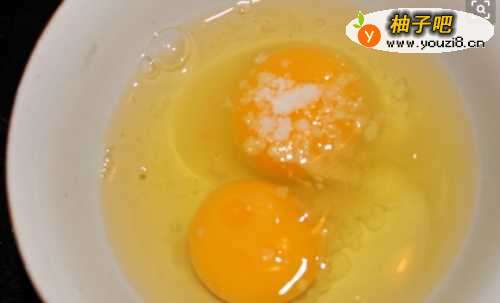 3用二个鲜鸡蛋打入碗中,将鸡蛋打均匀,加入几滴清水到蛋中,再将蛋汁均匀的淋洒在草蟹上