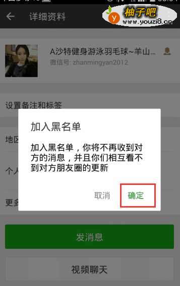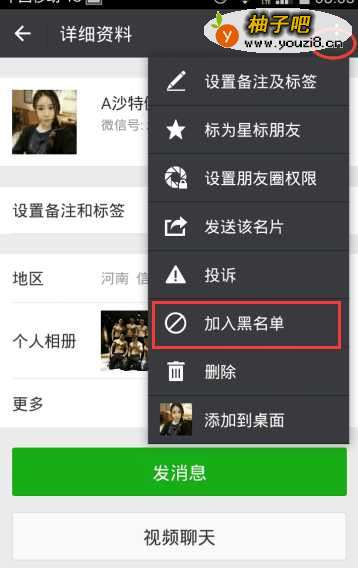 5进入新的页面,点击右上角的按钮,弹出一个下拉菜单,如图所示选择【加入黑名单】字样的按钮。