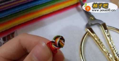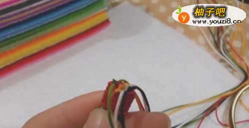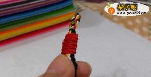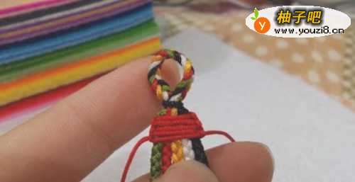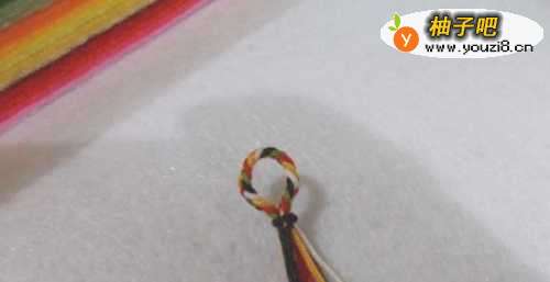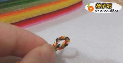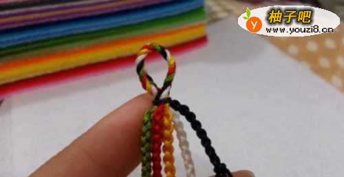 2编得差不多大能作扣眼的时候对折,取其中的一根线绕住打个单扣,此时每种颜色的线成了2根!