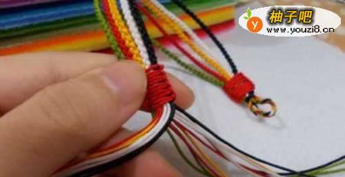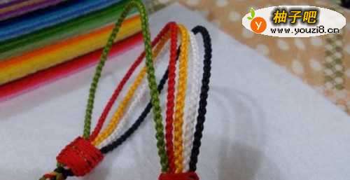 4另外取一根40cm左右的红色玉线,在之前编好的四股辫上打上平结,注意要把五根四股辫编在同一平面上,五色的排列最好是按照绿·红·黄·白·黑的顺序。