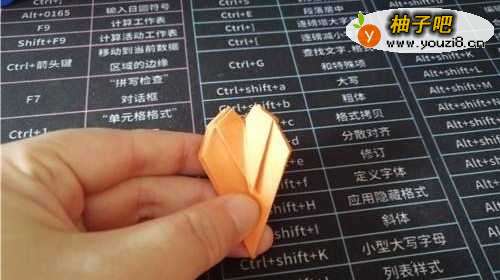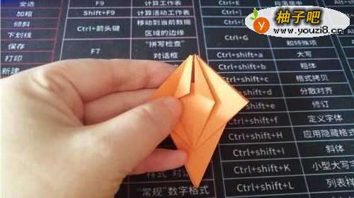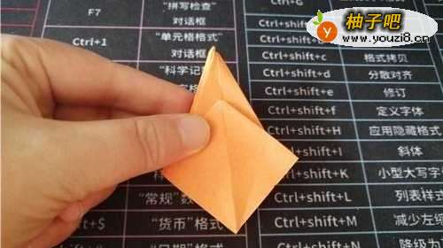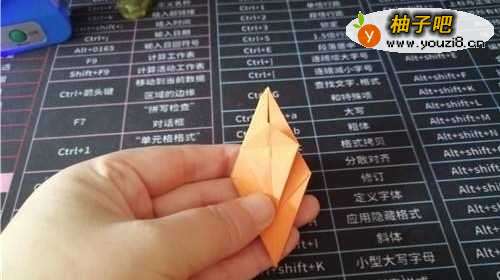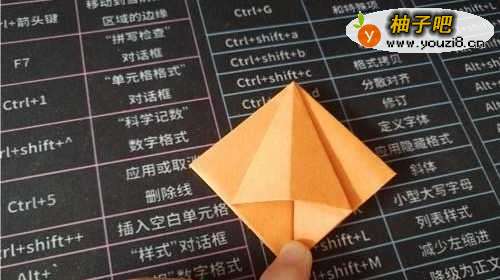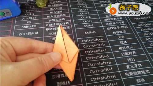 6我们把上面的角全部向下折,把上面露出来的小角从中间撑开,如图三的样子。