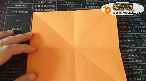 先把彩纸的中间折出米字,再把四个角向内折,然后向后收起,如图所示。