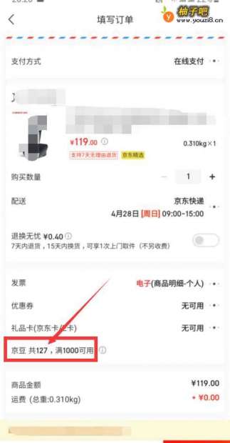 4在结算页面,可看到京豆数量,且需要京豆数量超过1000才可使用,点击后方叹号可查看京豆使用规则。