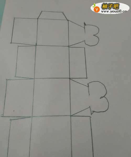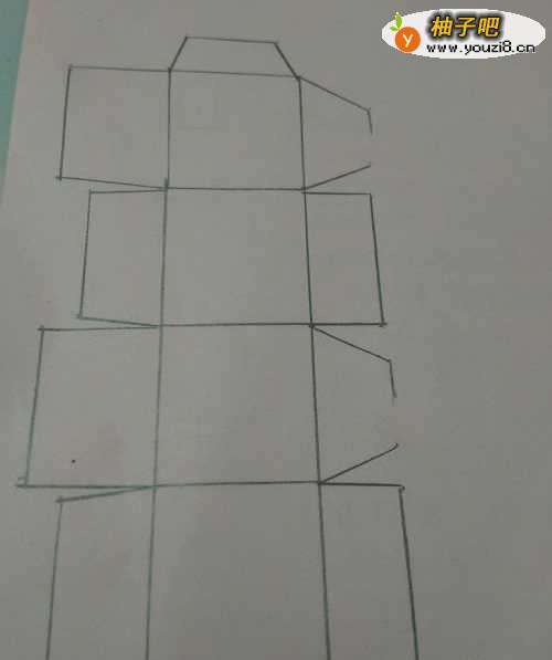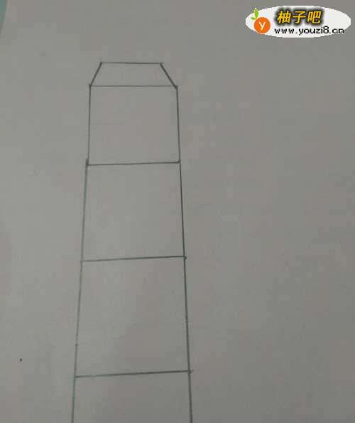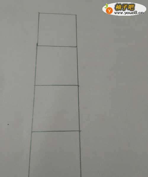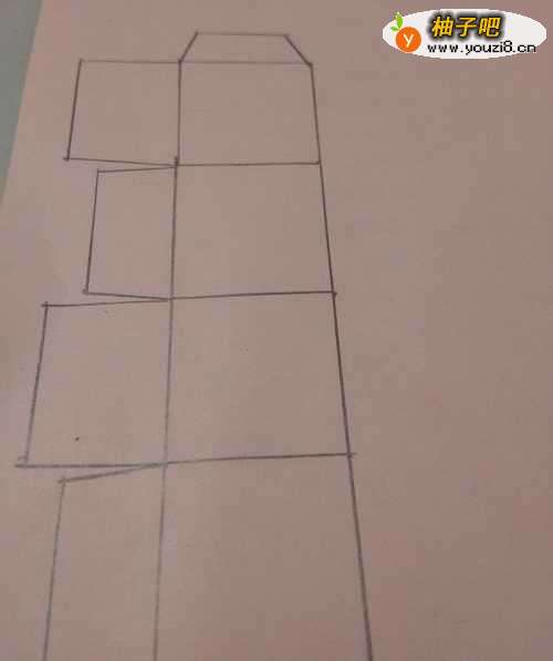 6在四个正方形的右侧,再分别画两个大的梯形和两个长方形,两个梯形的右边只画一半。