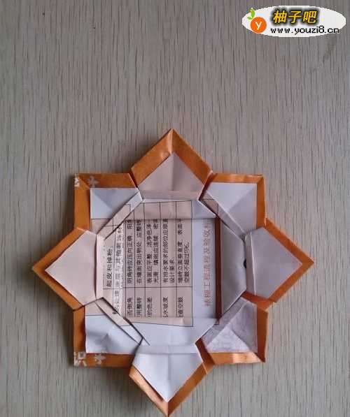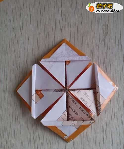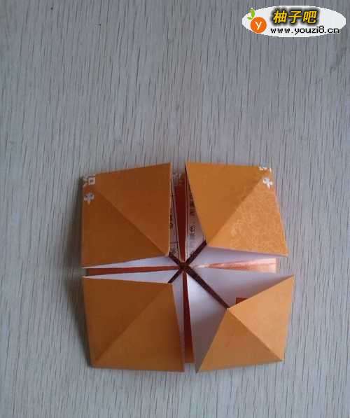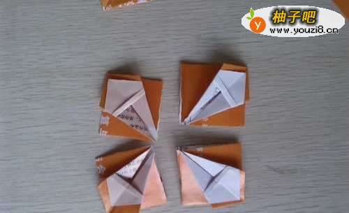 8把里面的四个角翻折上来插到四个瓣的纸缝里。