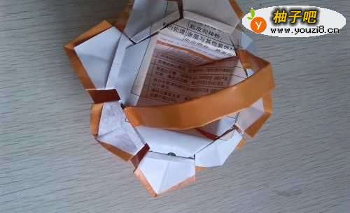9从底部沿折痕把花篮捏起来,再折一个篮把,就大功告成了。