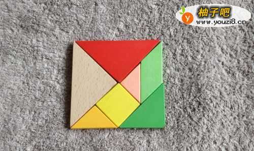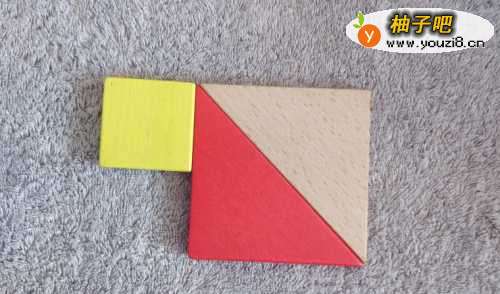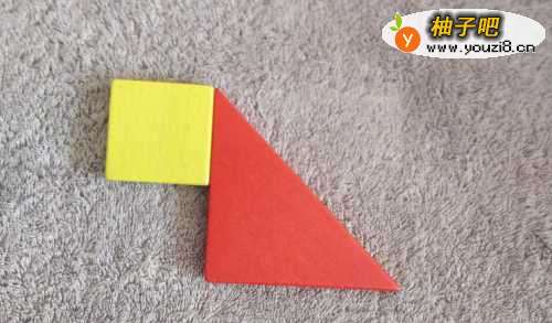 3将正方形放在红色三角形的左侧挨着,右上顶点挨着红色上顶点。