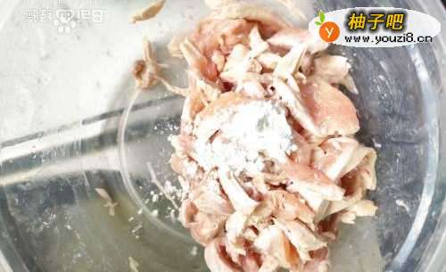 先将鸡胸肉洗净切成条状,再倒入淀粉抓匀,这样煮出来的鸡胸肉会更加嫩滑