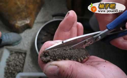 2沿着海参的腹部将海参剪开至头部,将位于海参头部的海参牙去掉(海参牙是在头部类似石膏状的白色物体),并将海参腹腔里的脏东西洗净。腹腔里有长条状的筋,是可以吃的,不要当成脏东西扔掉了。
